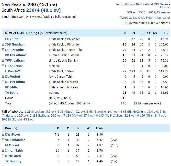 Pitch was not easy but SA played sensibly. NZ were 156/9 in 34.4 but their Ronchi and Boult took the team to 230