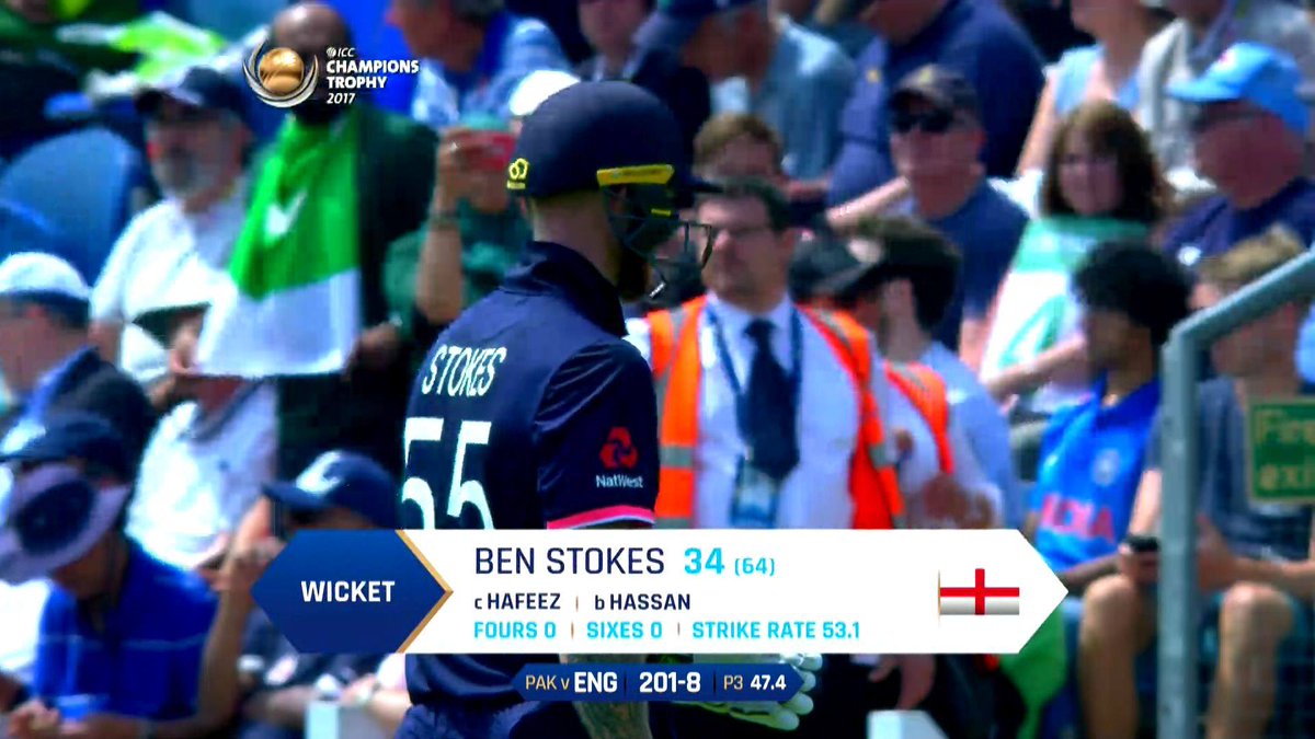 BA Stokes c Mohammad Hafeez b Hasan Ali 34 (64b 0x4 0x6) SR: 53.12