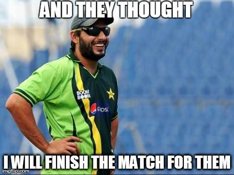 Afridi 4 overs 43 runs (many tell us here he is a bowler first), no wicket scored 14 runs and a pathetic shot to get out. Phattu cricketer. be afridi , be very afridi and lose the match.