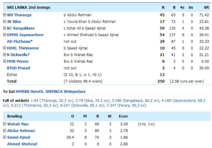 Saeed Ajmal and Junaid Khan need to step up to the plate...only Abdur Rehman managed those 2 wickets. The only way Pakistan wins this is by a enormous SL collapse...I'm praying for one.