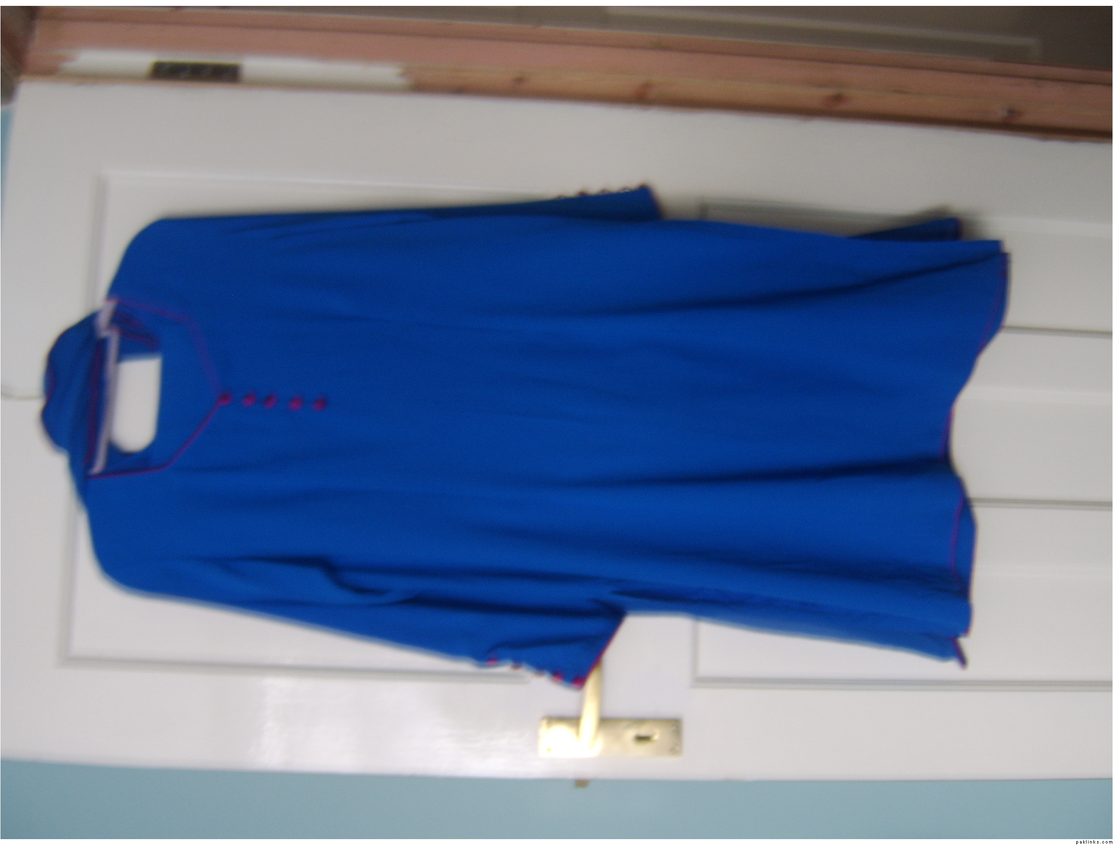 blue outfit, with pink buttons, front view