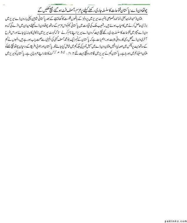 Well I think Akmal should also be replaced with some talented young wicketkeeper/batsman. We are in situation now to do some more positive experiments that may be giving chance to Khalid Lataif in one of two matches. Another important thing is, place of Misbah, he is good for limited over and but from the aspect of technique he is not that talented player nor his age is in accord with future player which can fulfill the gap of Inzimam. We should also think about that position very quickly, especially for the test matches so that a young player can be groomed to fulfill the gap of Inzimam in terms of quality.