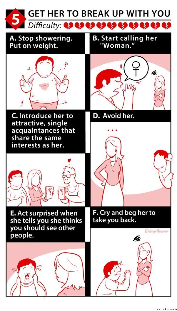 ****Breaking up with someone is the worst. They get all sad and start crying. Then they’re like, “But I thought you loved me.” Awkward! Who wants to deal with that? Not me. Here are five fool-proof ways to kick someone out of your life without having to watch them turn into an emotional wreck. Note: Although these all say “girlfriend,” they’re sure to work on boys, too.