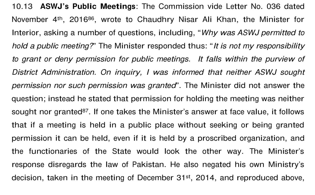Reply of Chaudry Nisar Ali Khan to the letter sent by the Commission about a proscribed organization to hold public meetings.