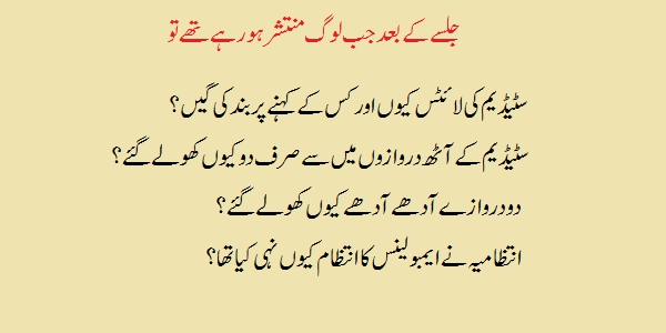 According to samaa local adminstration used water canon to disperse ppl lights were switched off as soon as ik left we have been hearing news of power cut down by local adminstration since yesterday. Only 2 gates were opened out of 8. Proper investigation should be done whoever responsible gov or pti should be held accountable. May Allah bless the departed souls n give sabr to their families.