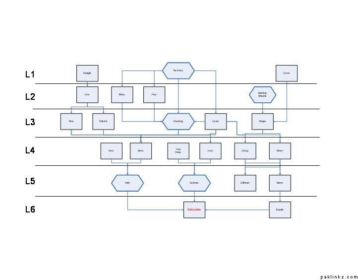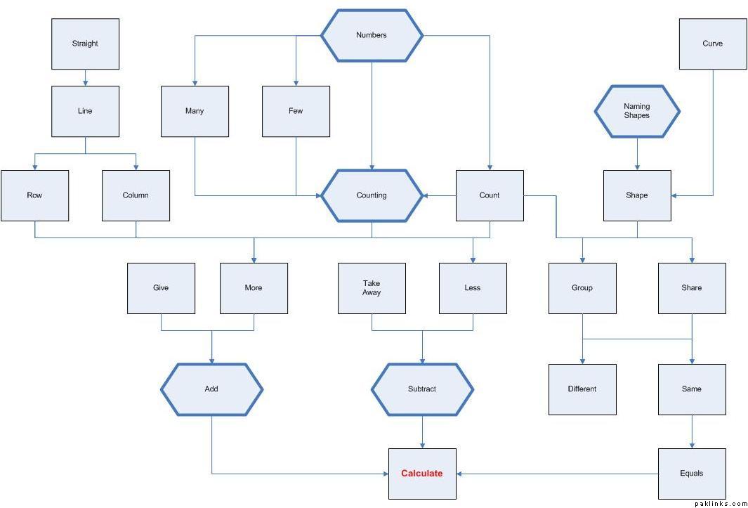It is based on the following diagram, it comes as concepts to be taught shown as rectangles, preparation activities shown by the irregular hexagons and the lines show the order of teaching going down the page. There are 6 levels which should be implemented in the span of between 2 weeks to 1 month.