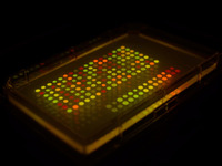 At this point, the bacteria on the nitrocellulose paper remain invisible. But the message receiver can turn on the key genes and make the colors light up by pressing the nitrocellulose paper into an agar plate containing a chemical trigger that activates expression of the fluorescent proteins. (The proteins chosen to light up are ones the bacteria don’t normally use, so unless the researchers activate them, they stay quiescent.) As long as the receiver knows which colors correspond to which characters, the message is revealed. But Walt and his colleagues added one more safeguard as well. Into some bacteria they inserted genes for resistance to particular antibiotics; the idea is that only the antibiotic-resistant bacteria are carrying the real message. If the message fell into the wrong hands, the receiver would see a mix of colors once the genes were activated and be unable to read it. But if the decoder added the right antibiotic, nonresistant bacteria and their colors die away, and the message becomes clear. The first example, reported in today’s issue of the Proceedings of the National Academy of Sciences reads “this is a bioencoded message from the walt lab @ tufts university 2010.”