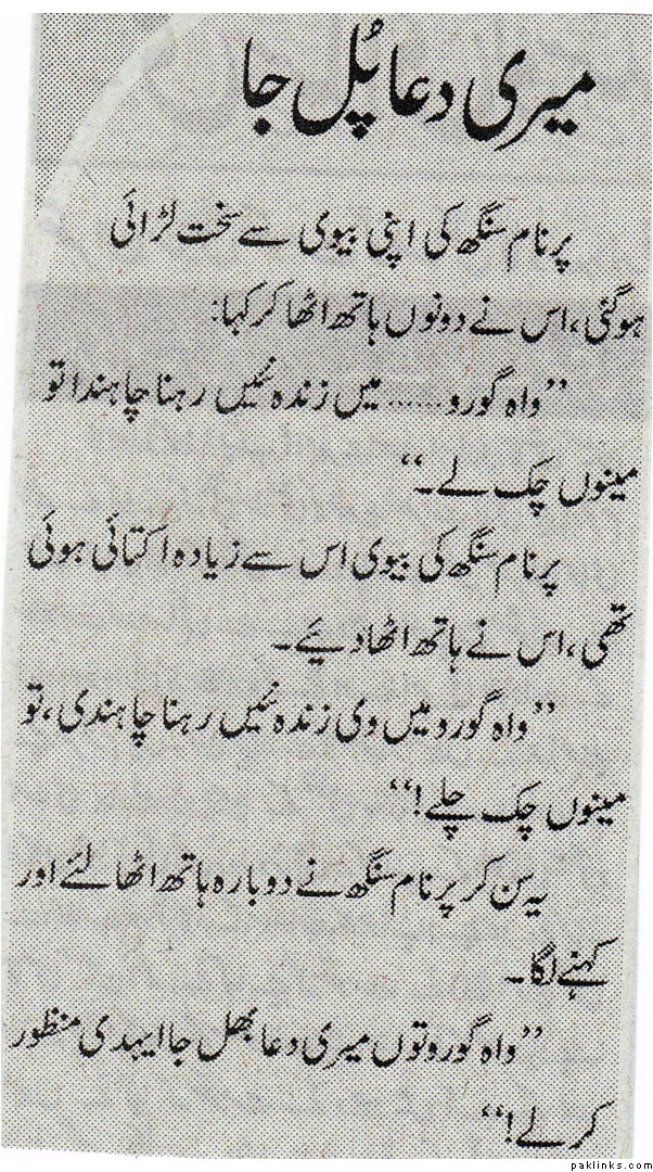 **Parnaam singh (yes, again) had an argument with his wife. He raised his hands and prayed "Waah-e-guru, I don't want to live anymore. Just take my life away!". Parnaam's wife was even more sick and tired of him. She also raised her hands and prayed "Waah-e-guru, I too don't want to live anymore, take my life away as well!".