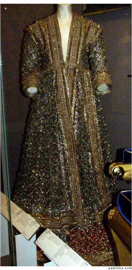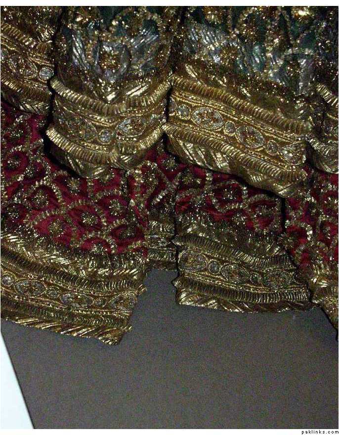 its the usual sharara with the regualr flair… the shirt however is also flaired. like an anarkali.. 6 kalis… but its front open right below the empire line and then conttinues like that. the chest area has aar kaam filled in. and the rest of the shrt has close chatta. the shirt end has bigger motives that basically go around the whole of the anarkali front an black. there are no side slirts just like there are none in an anarkali. ( fahad hussein has kind of a similar style.. its not an anarkali though)