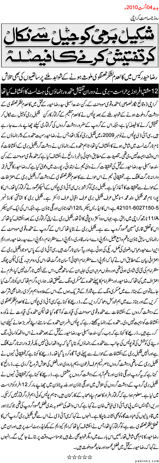 but where is your proof that MQM has done this? When a guy from ANP or PPP dies then its MQM's fault and when a guy from MQM dies its also MQM's fault. Where is the logic in that? Lyari where most gangsters are born is PPP's stronghold and ANP warned MQM that they can also use their Pakhtun ways of using the gun. Taliban have moved into Karachi but the Sindh Government has done nothing to stop that. Raza Haider was a great and honest man and these scum have killed him not only cuz of his stance on crime but also his ethnicity. Btw are you even from Karachi cuz I see mostly people who have never even been to Karachi barking about MQM being responsible.