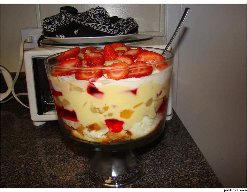^ sure can...'how' as in what was in the layers, right? right at the bottom is plain pound cake cut in thin slices, top that with any tinned fruit ( i used pineapple chunks ) including some juice so the cake remains moist, then its custard, jelly broken in chunks, whipped cream straight from the can, repeat the layers again and i topped it with fresh strawberries.