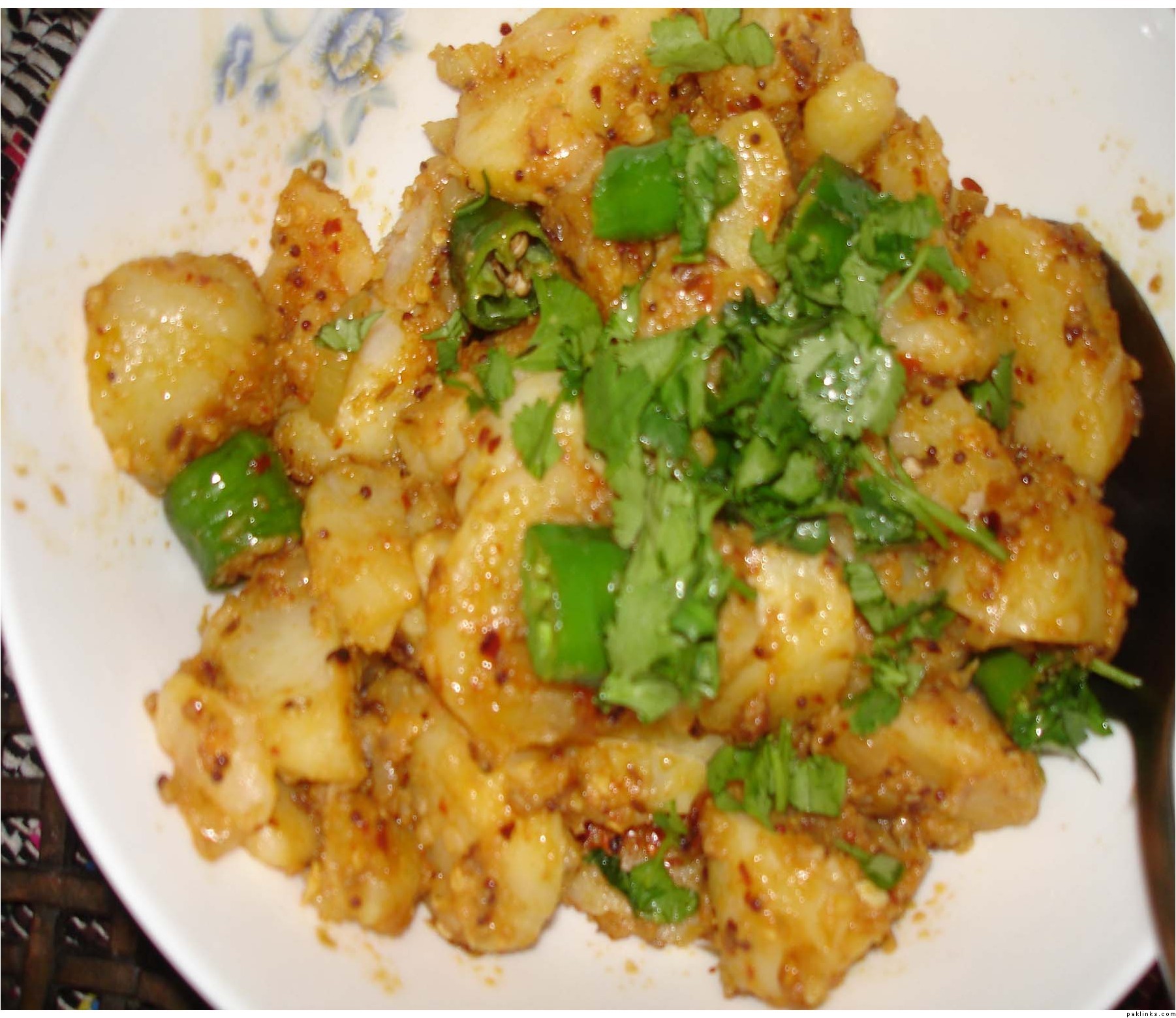 heat oil add 1 small onion and zeera ,dont brown onion ,just cook till color is changed..and then add all aloo., and bhoon for 5 min,use wooden spoon,garnish with green chicli and hara dhania,and serve,enjoy
