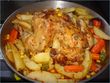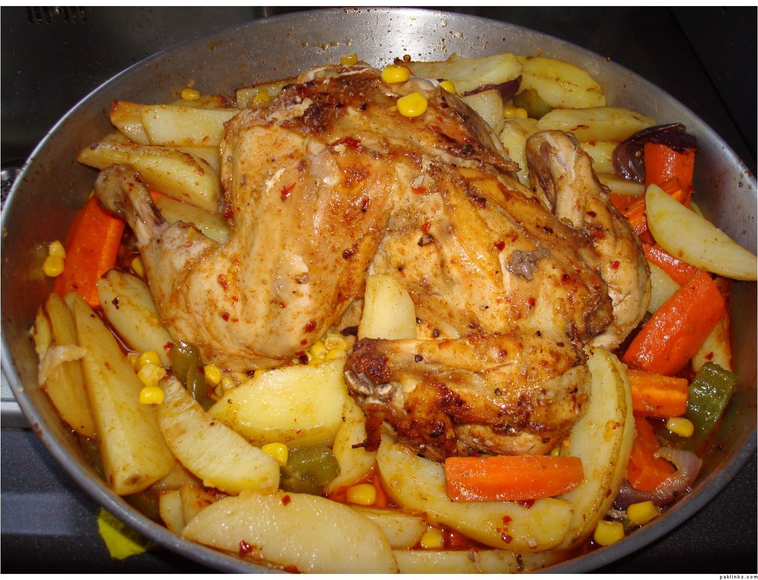 Then I put the chicken in the middle of the ovendish and around it I add: potato's, bell pepper, carrots and red onion. Sprinkle the same masala's on top with some olive oil. Mix well and put it in the oven. (220 deg celcius) for about an hour or a little longer, chicken and potato's should be soft. Turn the chicken halfway and make sure it stays moist (pour the juices over the chicken once or twice) and in the end add sweetcorn (from a can).