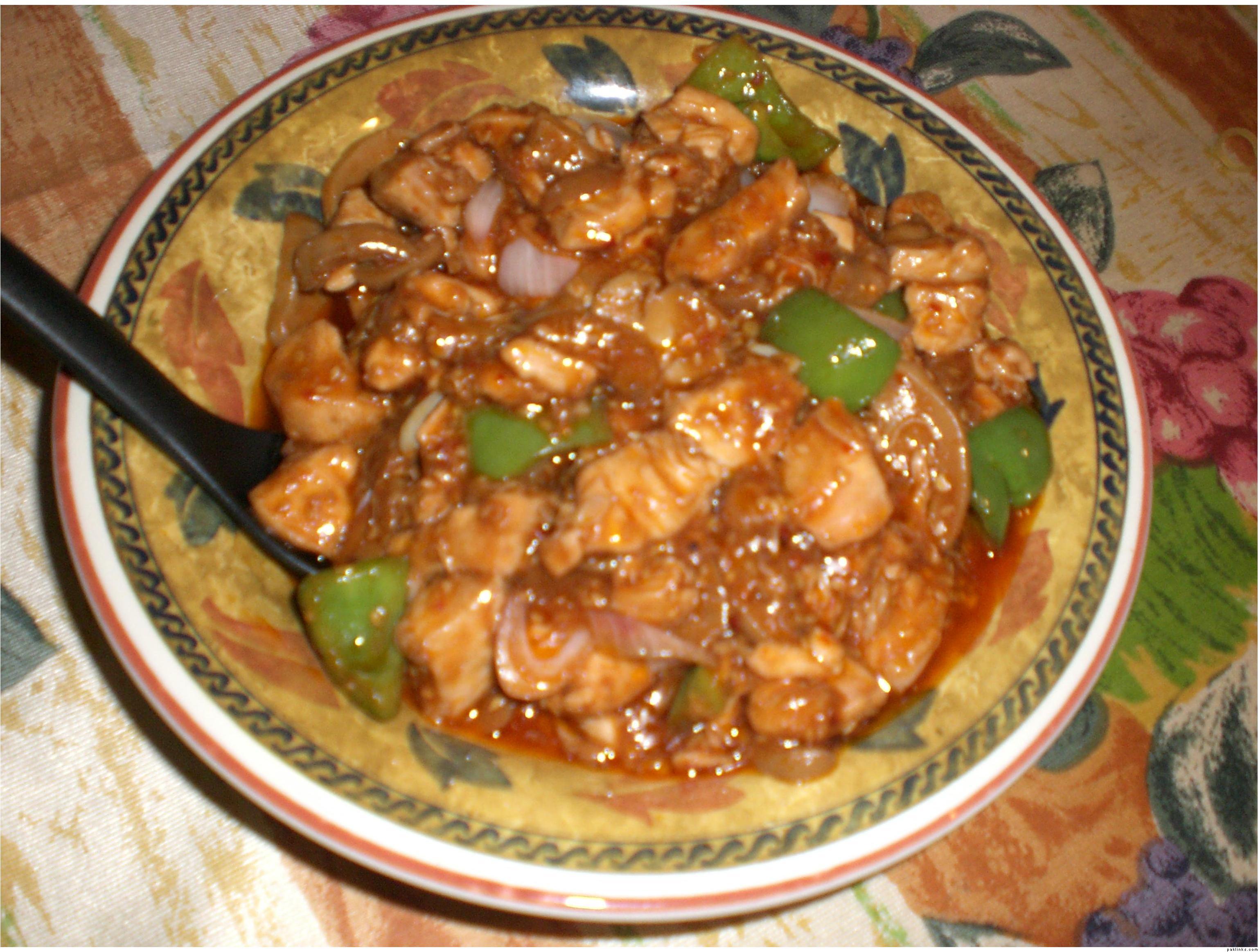 Saute chopped garlic in little oil and then add boneless chiken n fry till light brown den add +onions & capsicum(cubical cut)soy sauce+aginomoto+salt+black pepper+crushed red chilli+worchestershire sauce+vinegar+4tbsp ketchup+sesame seeds...keep stirring it on medium flame till the chicken gets tender...add half cup of corn flour (2tbsp) dissloved in water and 1tsp sesame oil...serve!