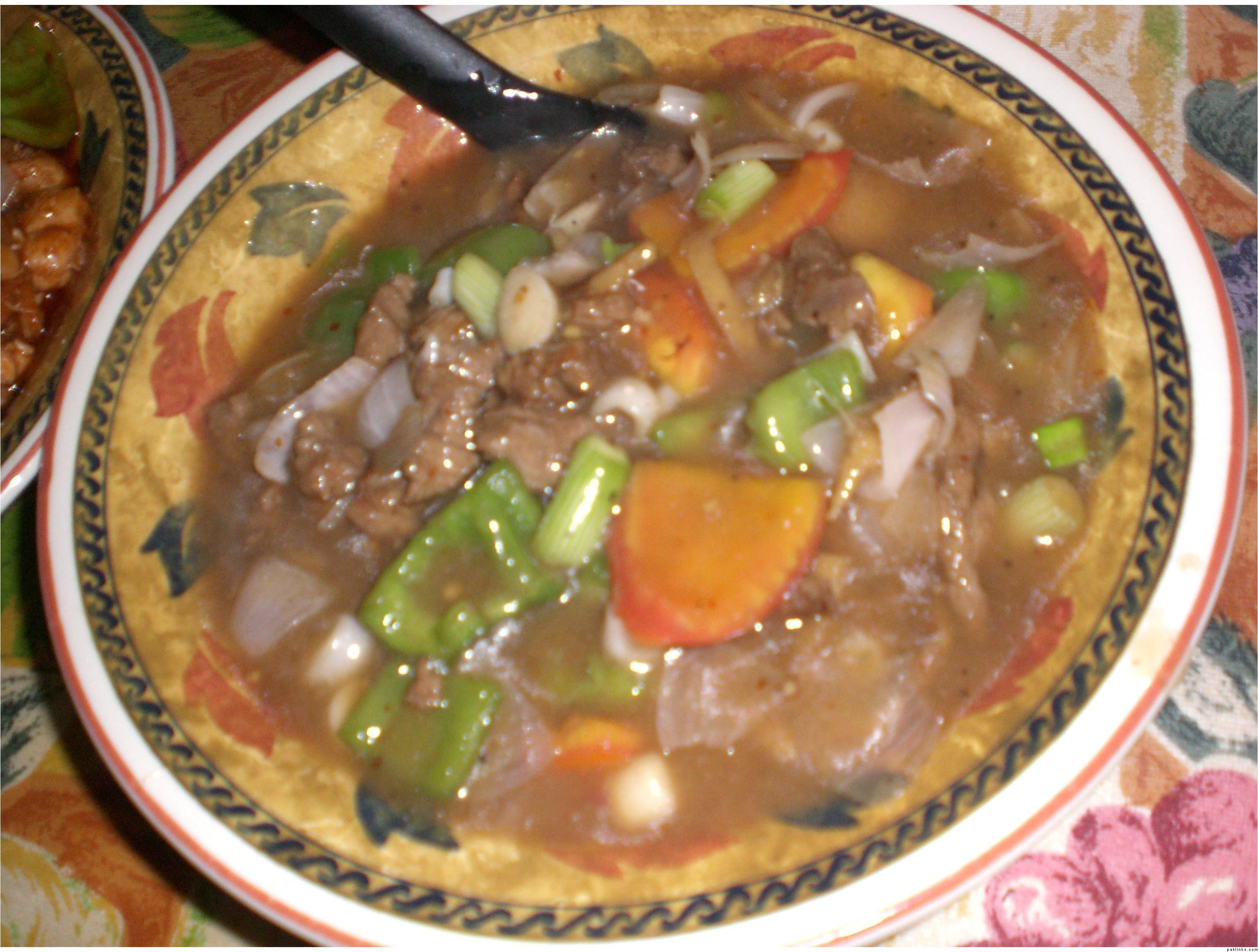fry ginger in lil oil...add in garlik and beef...stir fry it and add in lil water n let the meat get tender...den dry up all the water and add in soy sauce+worcestireshire sauce+salt and pepper+ aginomoto+vinegar+crushed chilli+ sliced carrots +capsicum(cubical cut)+onions(cubical cut) and green chillies...stir fry on high flame and then add 1tsp sesame oil and half cup dissloved corn flour!