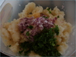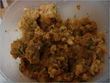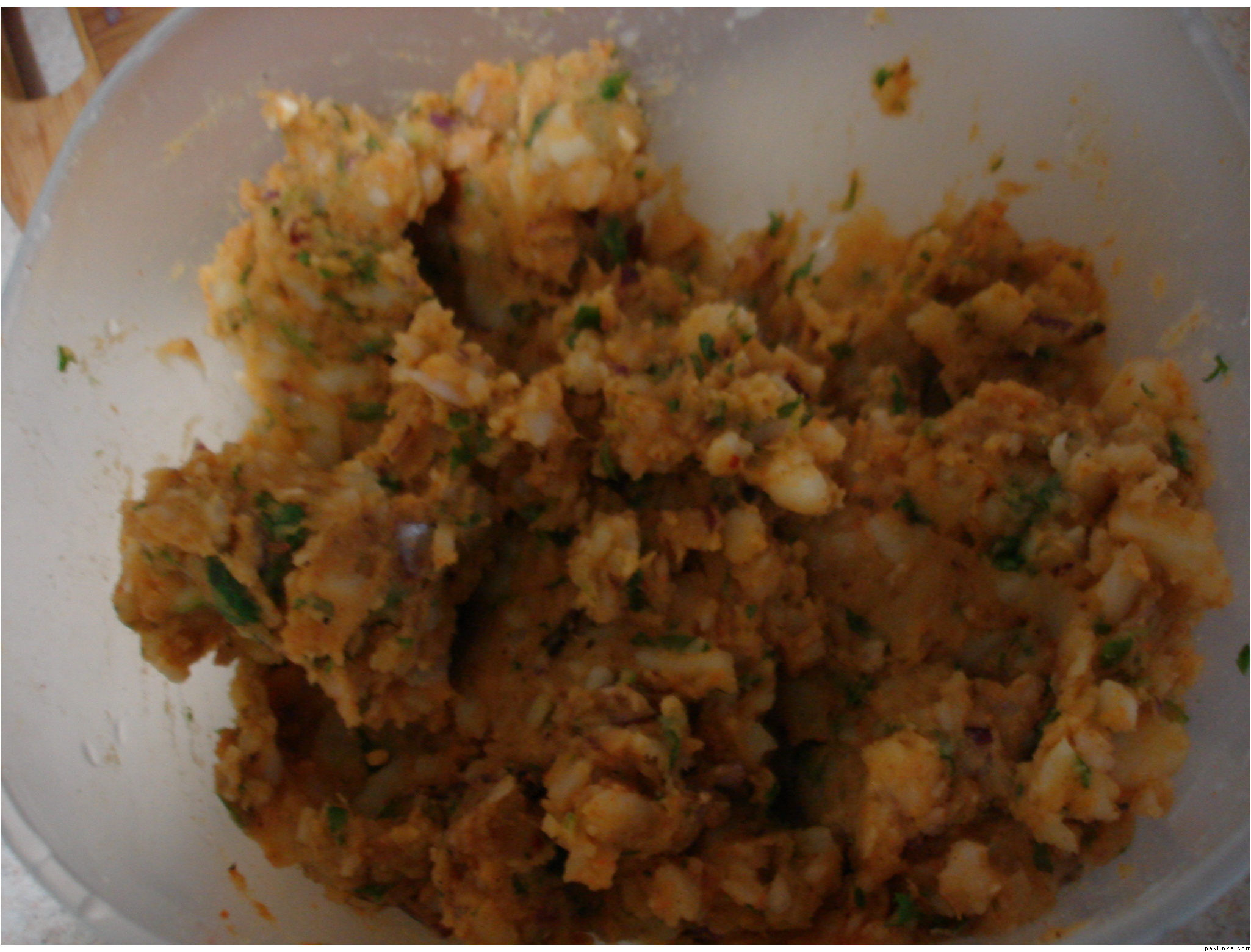 mashed aloo + diced onions + green masala (chopped up dhania and green onions)