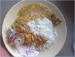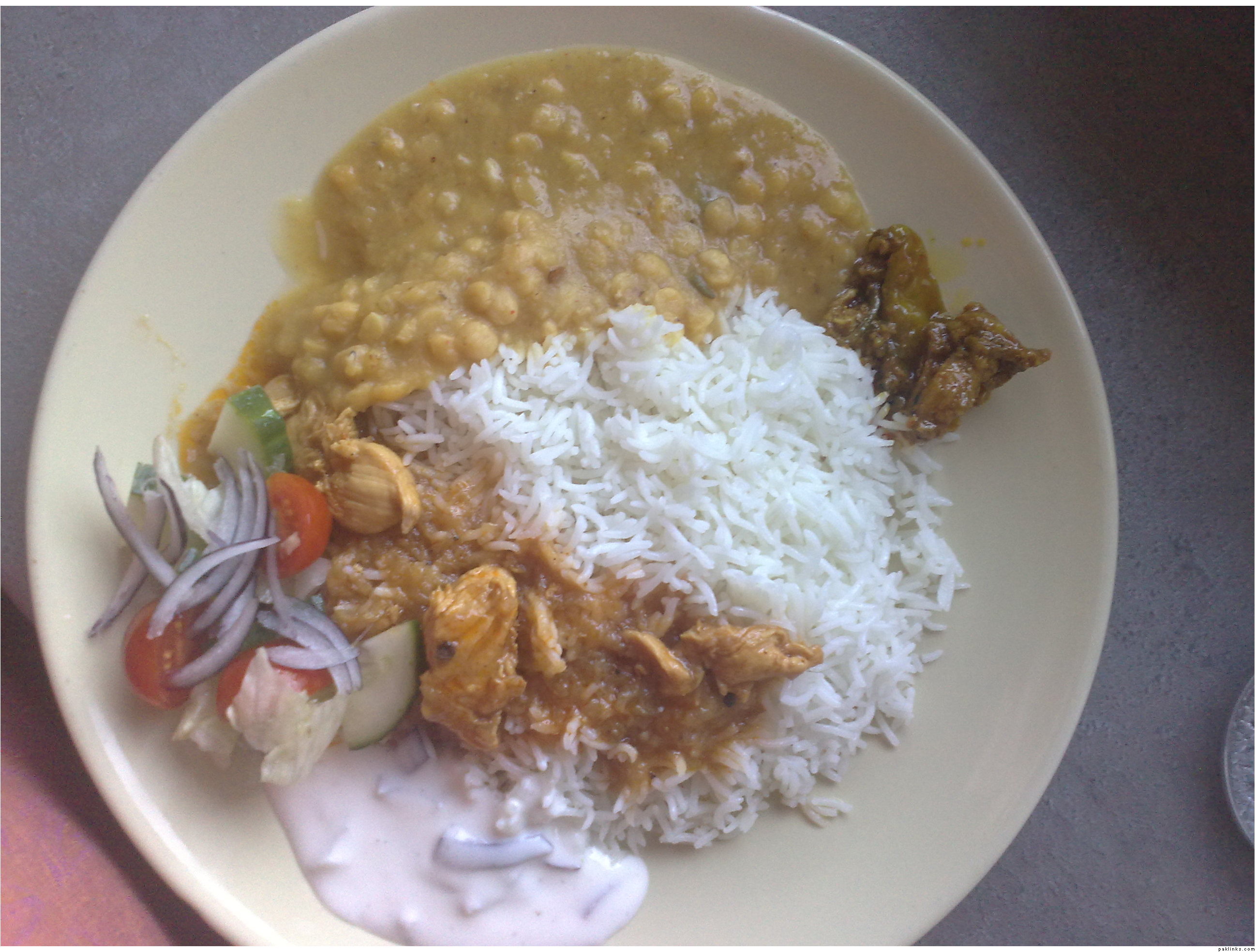 Boiled rice, chicken shorba, daal, salad, raita and achaar.