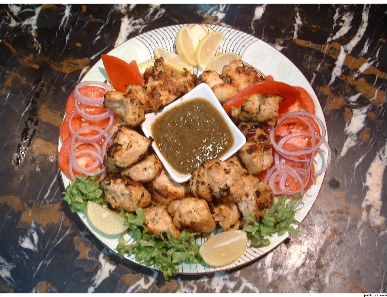 Mix the remaining ingredients together, blend into a smooth paste. Pour over the chicken cubes and Marinate for 2-3 hrs. Soak wooden skewers in cold water for 10 mins to prevent them burning. Skewer the chicken and Grill for 15-20 mins brush with butter in between. Garnish with lettuce leaf, tomato & onion slices, lemon wedges and Serve it hot with mint chutney.