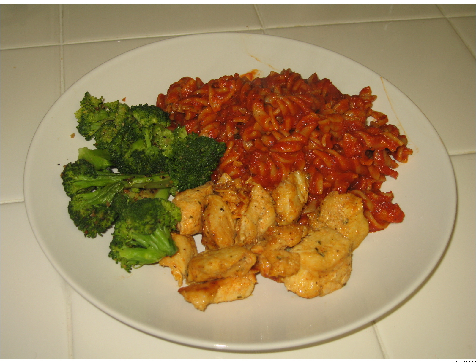 i bought pre-marinated chicken breast pieces from the halal meat store and stir fried them in a pan with one tablespoon of olive oil.