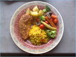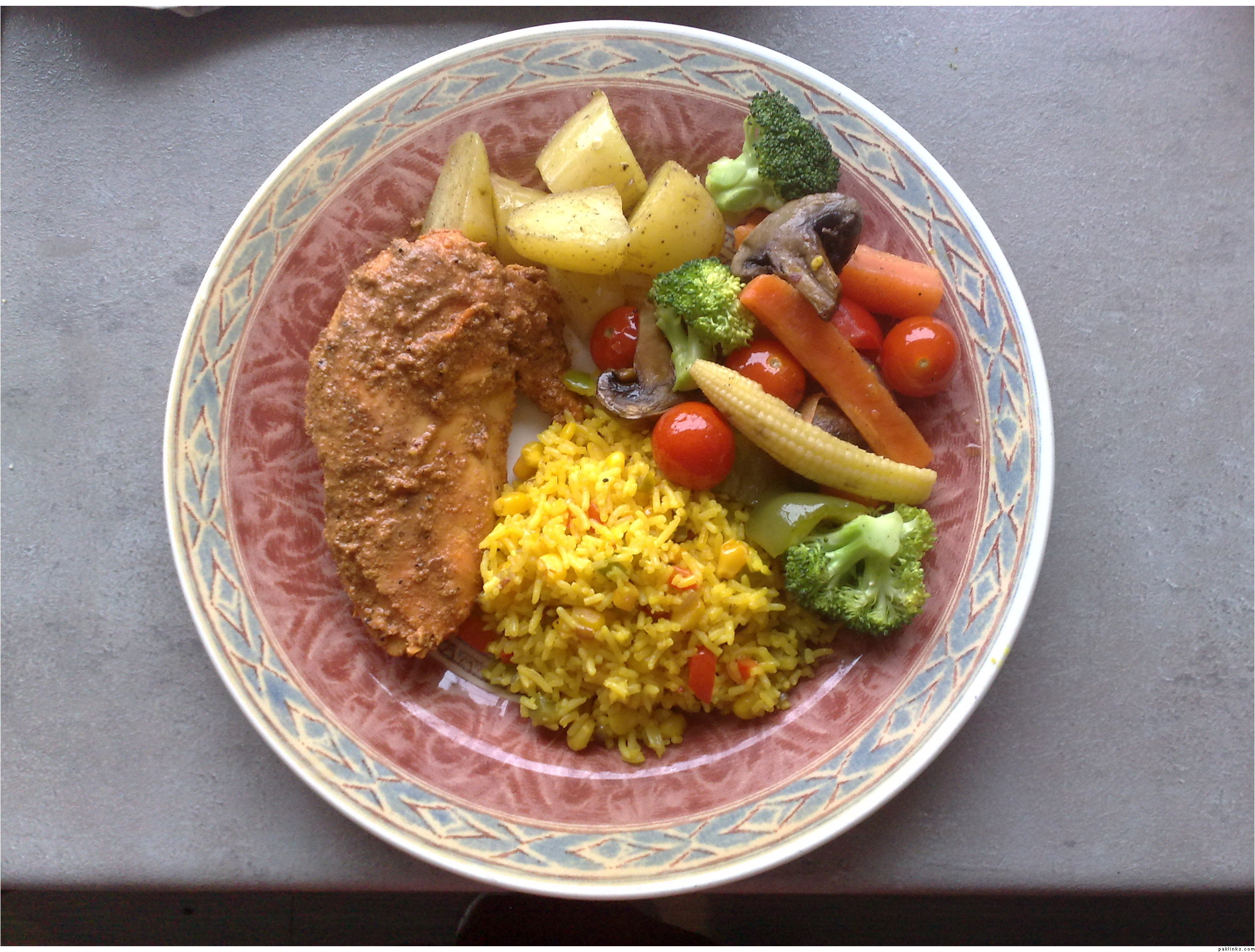 Steam roast chicken, pepper rice, roast veg and potatoes.
