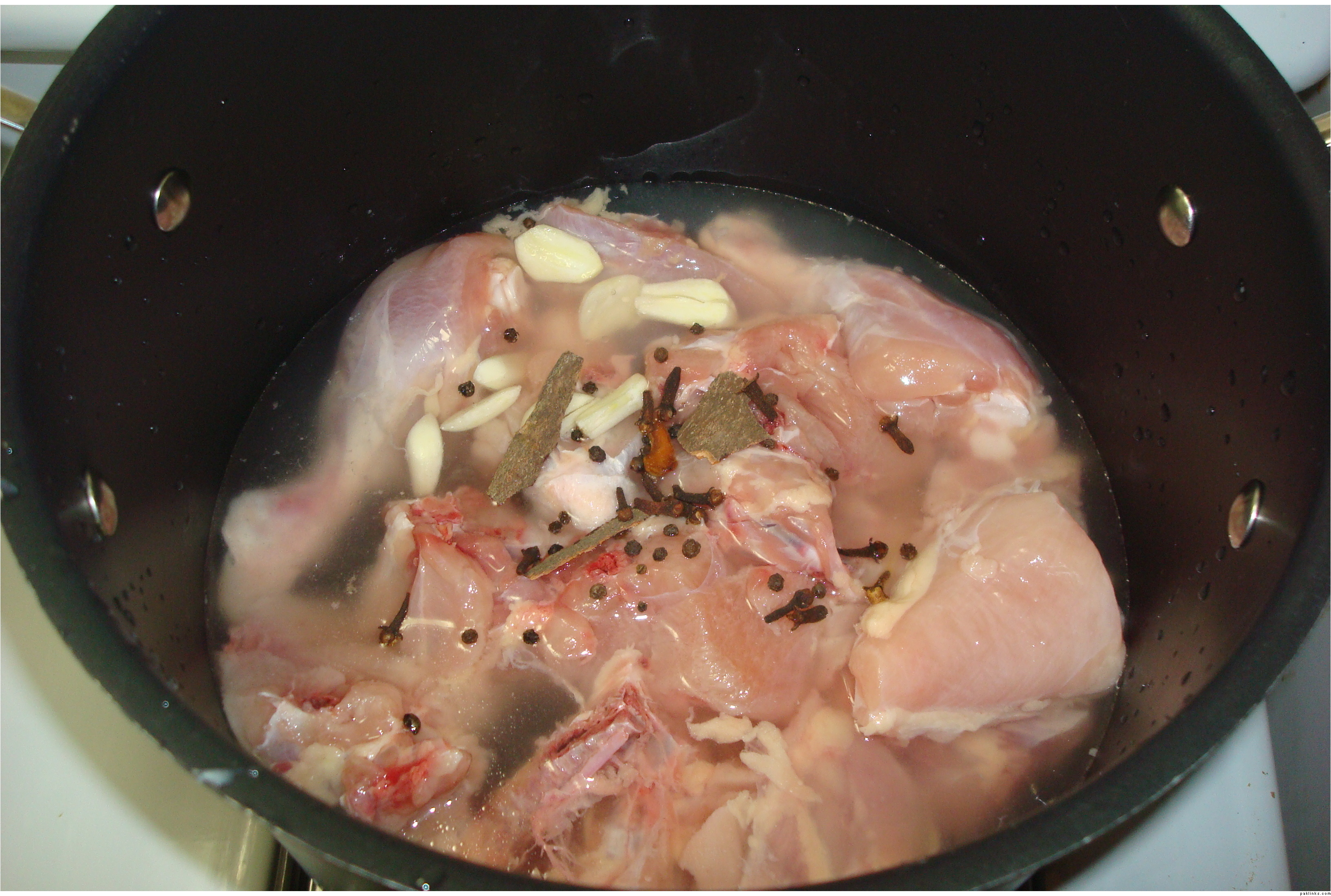 In a pan add chicken with few garlic cloves, black pepper, cinnamon and salt, and cook it on a low heat for 20/25 min. separate chicken from the yakhni.
