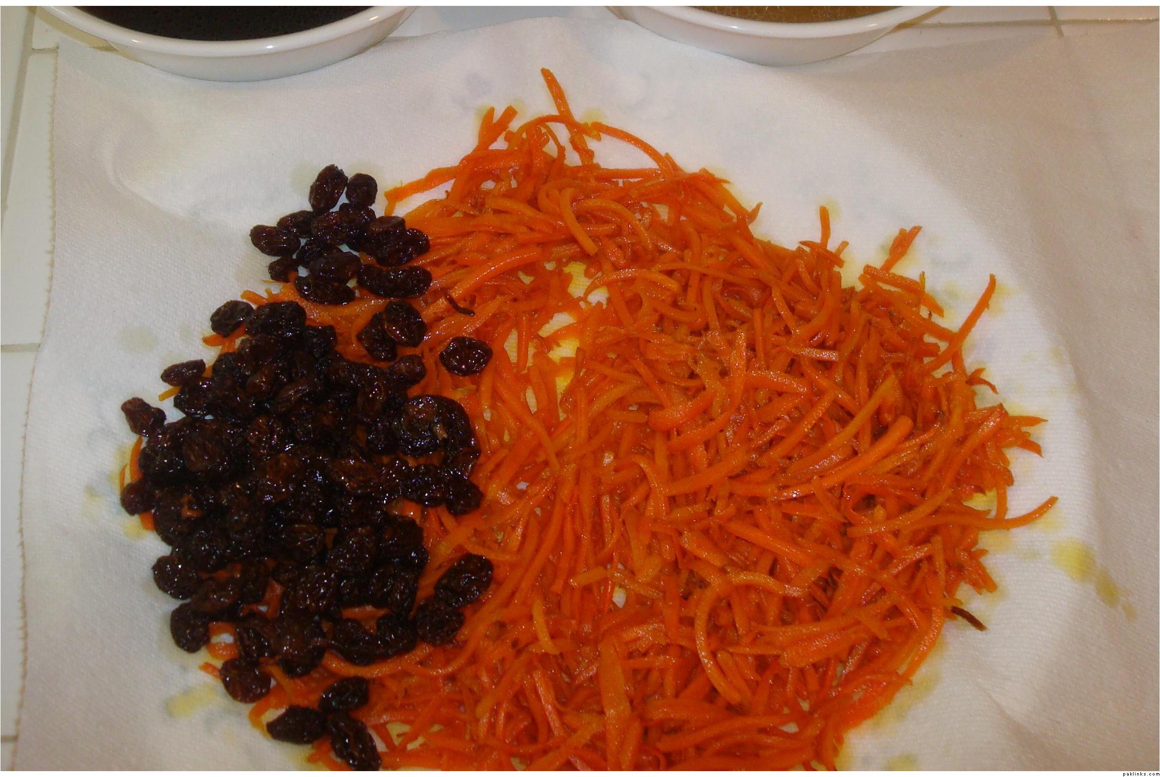 In a frying pan, heat 3 tablespoons oil over medium heat. Add carrots and 1 teaspoon sugar; cook, stirring frequently, until tender. Stir in raisins, and continue cooking until the raisins are soft and plump. Remove from heat, and set aside to cool.