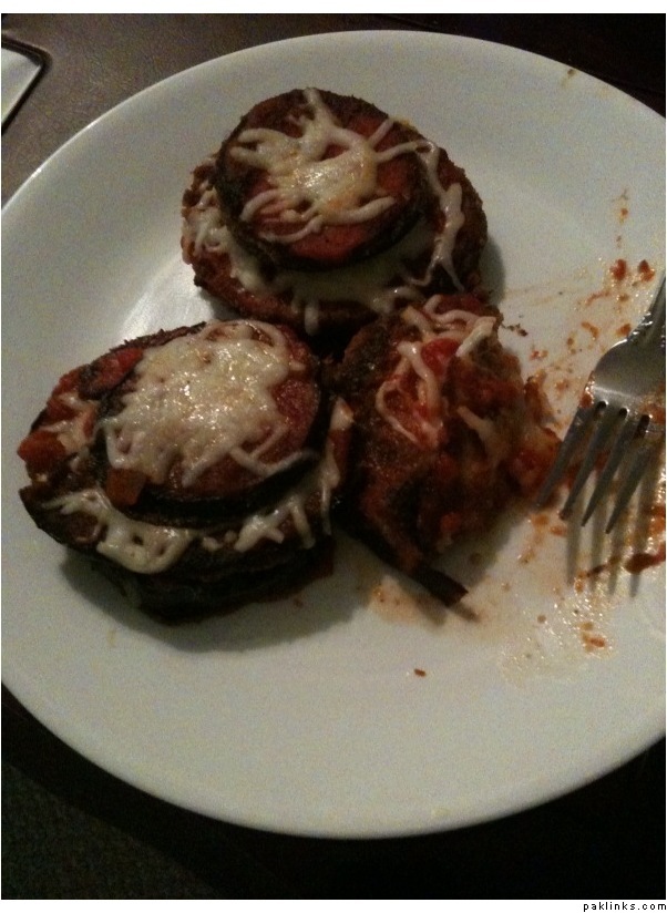 Cut a full-size eggplant into 1/4 inch slices. Dip them in beaten egg --> dip that in breadcrumbs --> fry