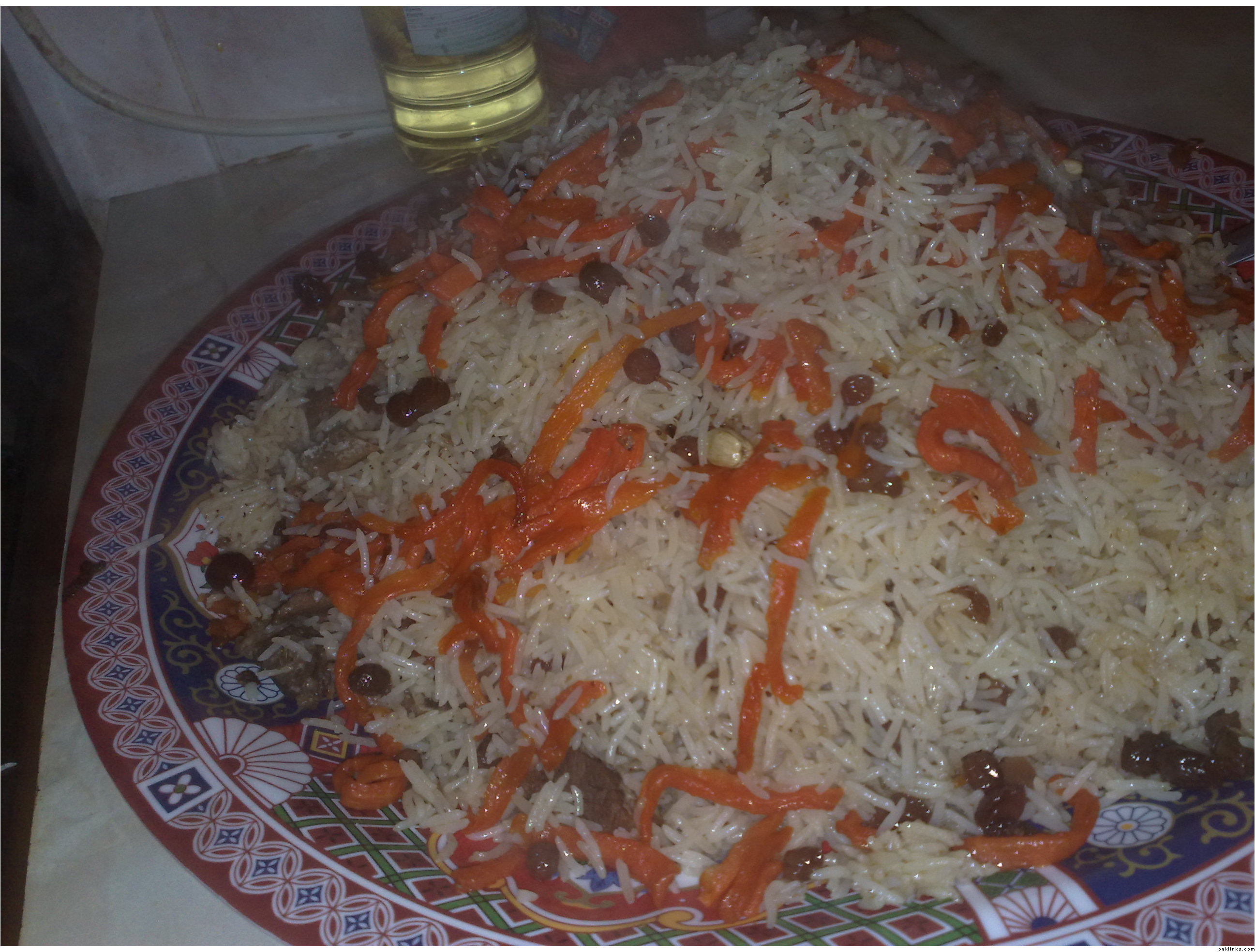 Return the rice back to the pot, add sugar syrup made earlier and mix gently. Also add the meat juice and mix gently. Bury the meat in rice or put it to one side, also put the carrots to one side. Foil the pot, and put the lid on or you could use one of those lid “covers” (i guess you can them back home from Pakistan, or Afghanistan) or use towel, and wrap around the put and then put the lid. Finally, place the pot either in oven or over a low heat for 30 - 40 minutes.