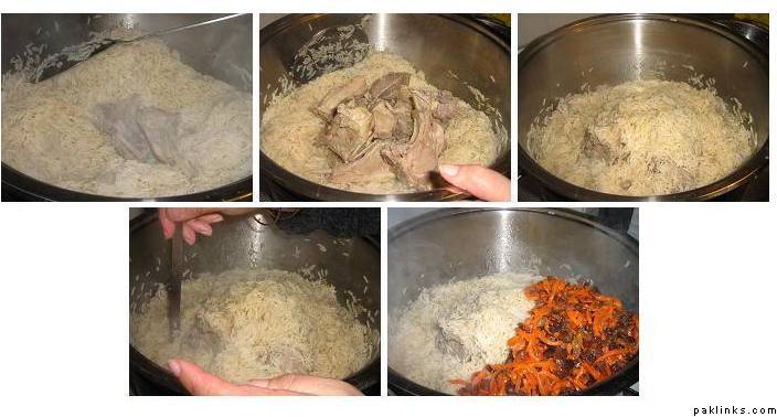 meat from the juice and set juice aside. 6 hours later, bring enough water to a boil in a big pot, add rice and salt. The water should come about 4 inches above the rice. Now add 2 cardamoms, this is to give the rice a nice smell. Do not let the rice boil too long, it should be tender but not mushy. As soon as it is tender, drain the rice in a large sieve