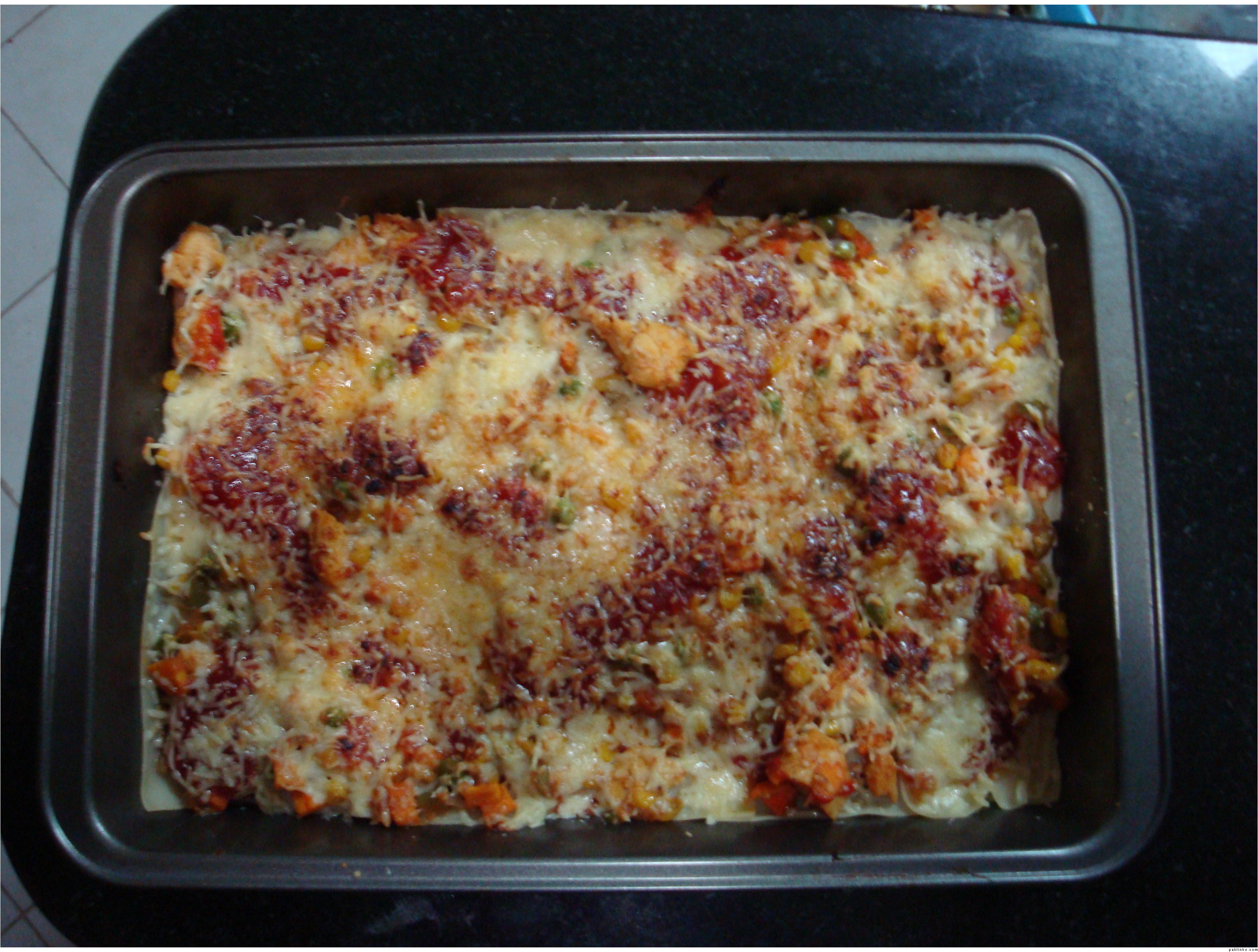 greese the baking dish wth oil or butter give layer of lassania sheets then layer of chicken mixture then add lil whit sauce all over it n thn tomato ketchupmake these layers again add chredded cheeze all over it then grill it in the oven till all cheeze spreads evenly