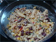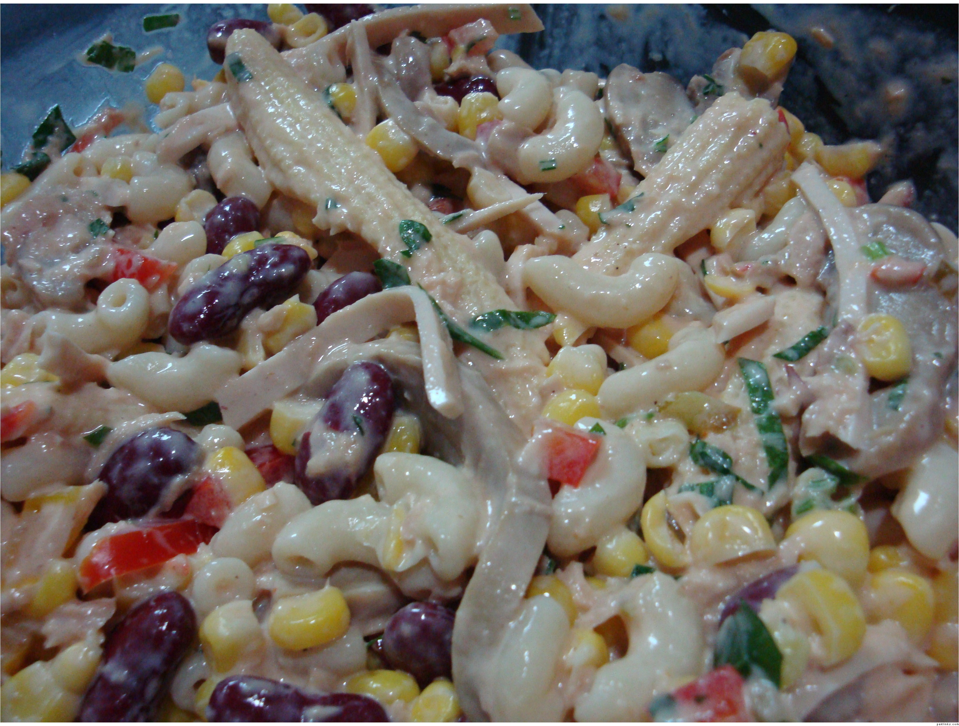 boil macronis in water with lil oil n salt in it......... boil boneless chicken separately wth salt n black pepper..........take a bowl add these macronis n chicken add boiled red kidney beans,green peper bell,carrots,corn and baby corn,add lil garlic powder n lemon juice in it mix it well.....(you can mix any salad dressing in it which you like but i make my own) in a bowl take tomato ketchup add mayonise in it , lil vinegar, salt n black pepper mix it well n then add in the salad n mix it well...............
