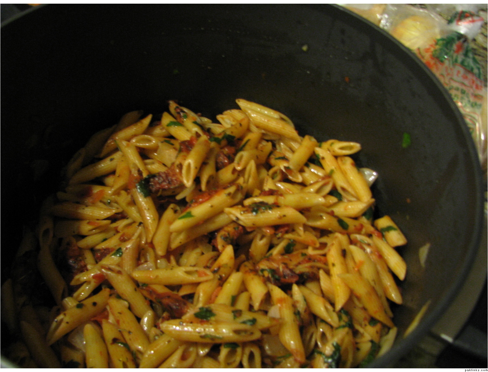 Heat the rest of oil in a pasta pan. Add crushed garlic, stir and then add some tomato sauce, mix in the herbs, salt pepper and red pepper flakes, top it with boiled penne and then pour in the rest of tomato sauce. Sprinkle parmesan cheese at the end and stir til it melts into the pasta. Taddaaa…now eat!