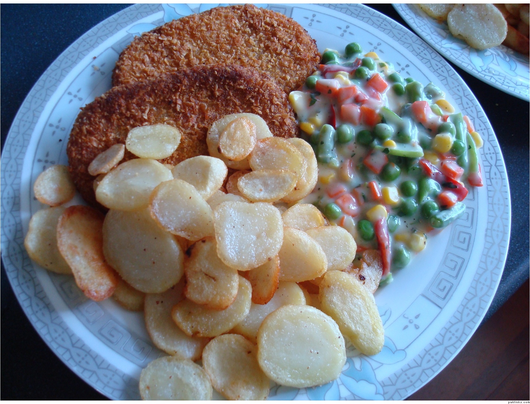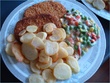 Today’s dinner: chicken shnitzels with vegetables in cheese/herbs sauce and potato wedges.