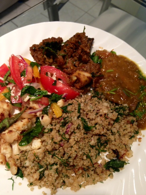 Im trying to cook healthy so I made dill and garlic quinoa, kali mirch ghosth (which turned out pretty good, Bhagari gobi, and Kali daal with my yellow pepper. tomato and basil salad)