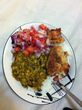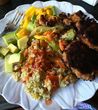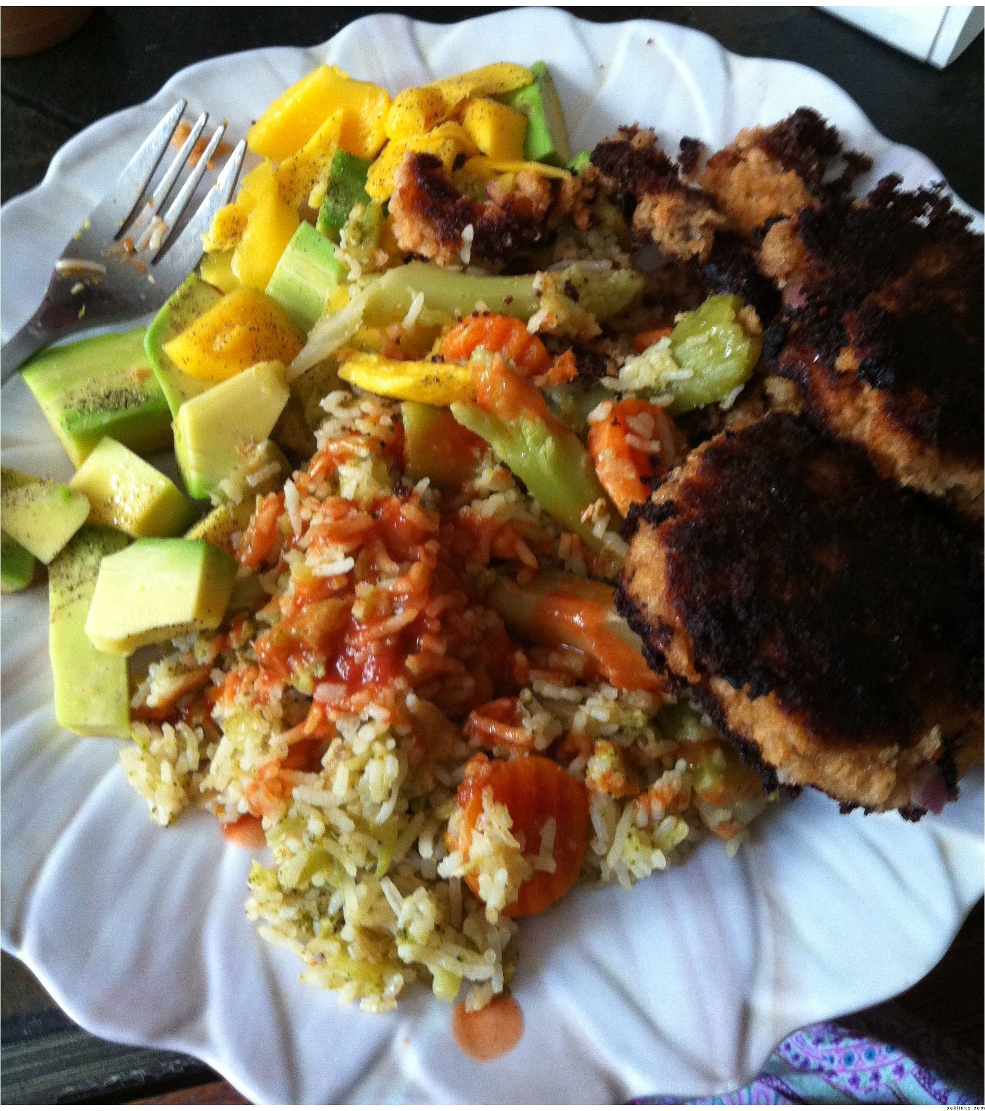 Leftovers of the above–made kabab out of the salmon, mixed hte veggies wiht rice, wiht chopped avocado/mango