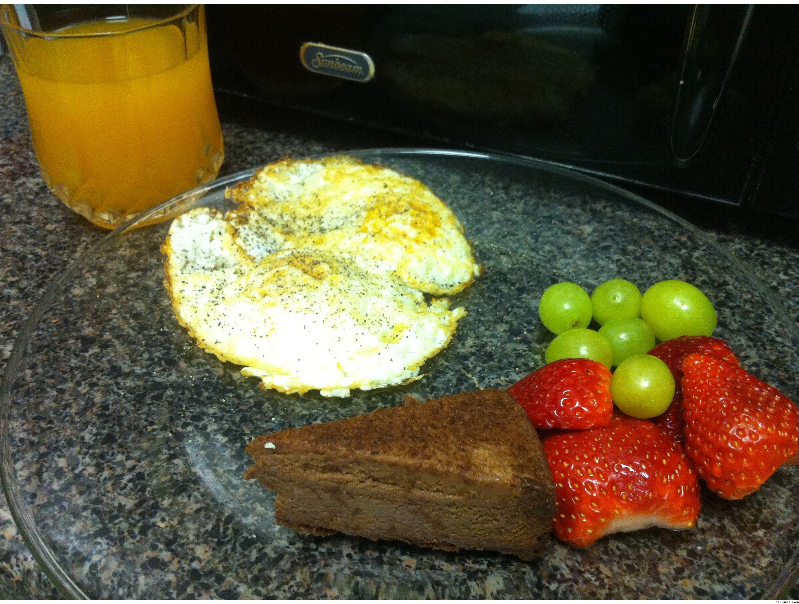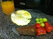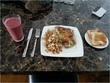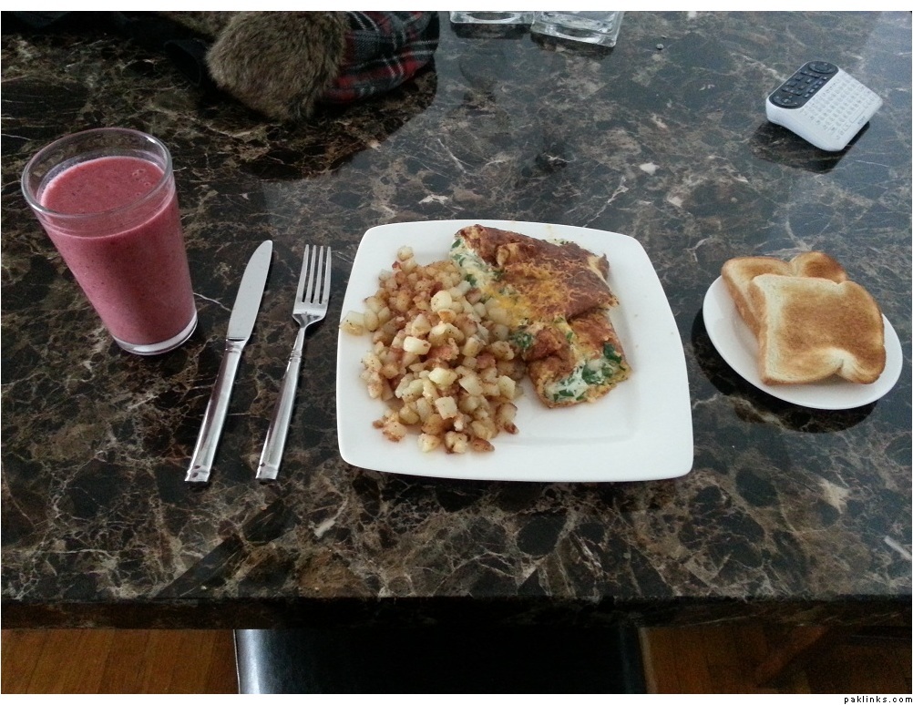Hubby’s birthday breakfast - spinach & ricotta cheese omelette, hash browns*, with berry smoothie and toast