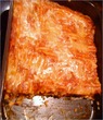 You can see the size of the pan I used. Cover the bottom of the pan with a bit of the lasagna sauce. Layer as follows: