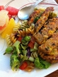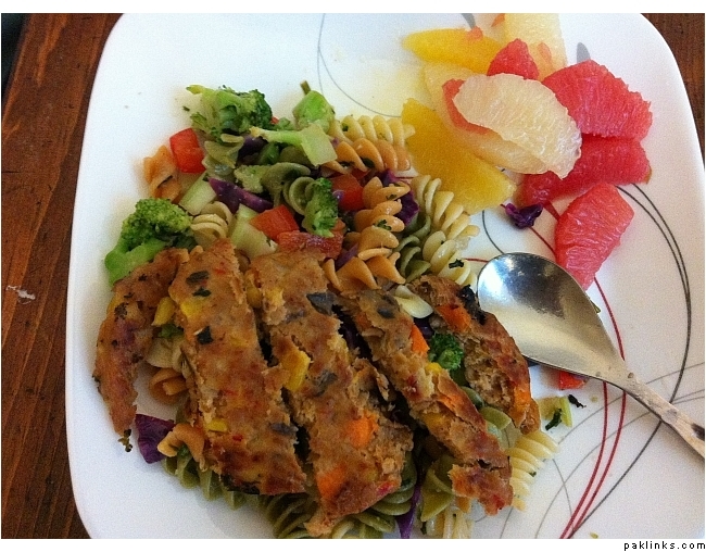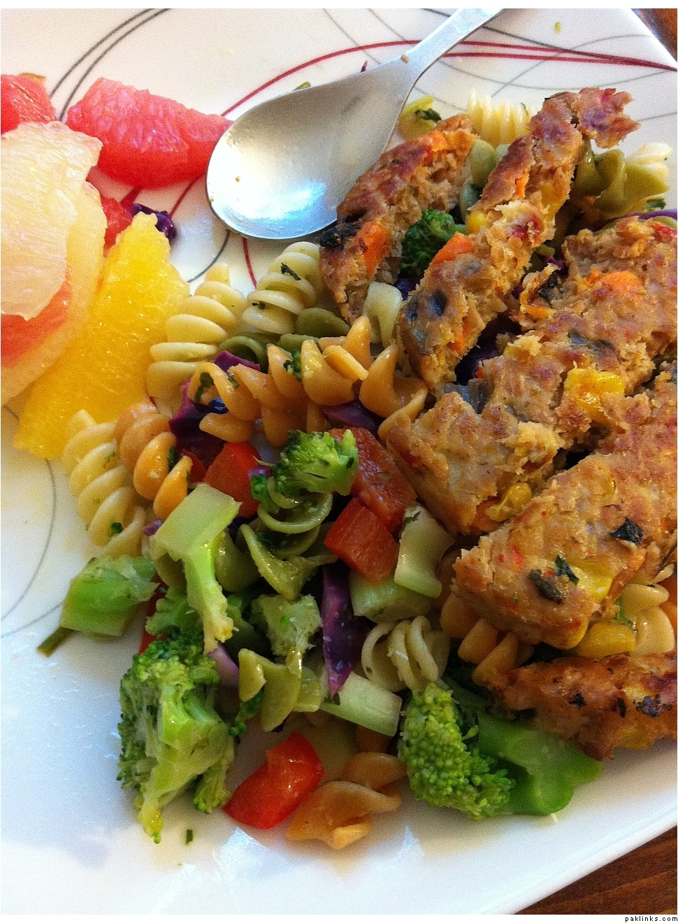 just…all…veggie stuff. Veggie patty. spirals wiht veggies. and grapefruit pieces on the side. (Yes I put it all on the same plate)