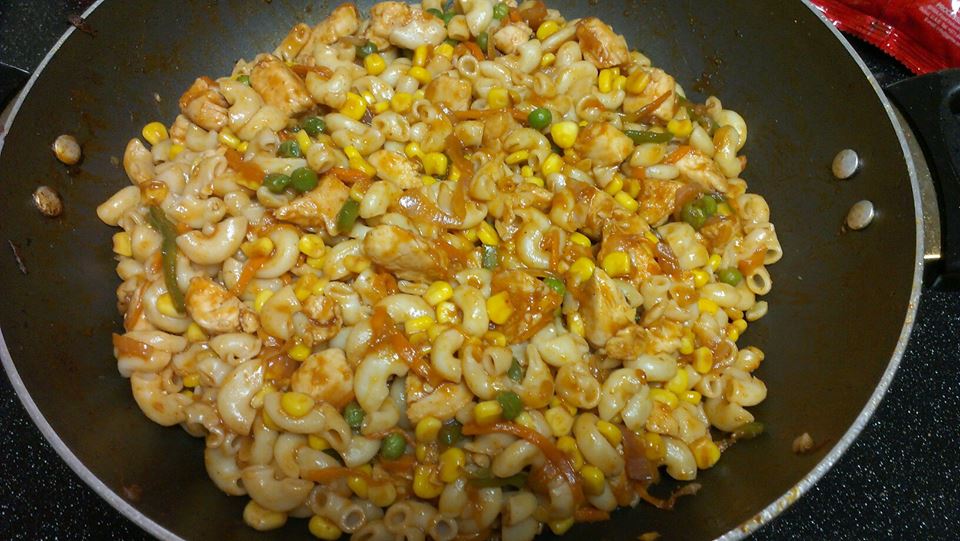 Heat oil in a large saucepan and fry the onions until slightly brown. then add peppers and fry for about 5 mins until starting to caramelise. Add the garlic and chillies, cook for 30 secs, then tip in the tomatoes. Add any frozen vegetables. I added peas and sweet corn. Season. I added a bit of salt and Italian mixed herbs. add some ketchup simmer, uncovered, for 10 mins.