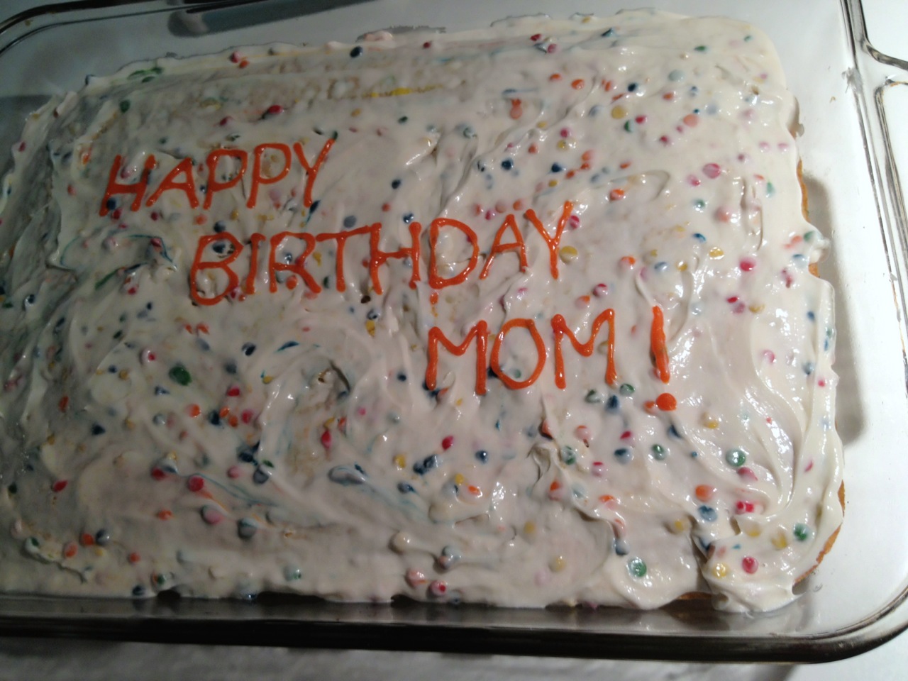 My lousy attempt at making a cake. I was pressed for time–Box cake mix + frosting out of a can…no hating! ![]()