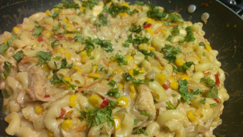 5. Add sauce and let chicken simmer in it for a few minutes. Add crushed chili flakes.
