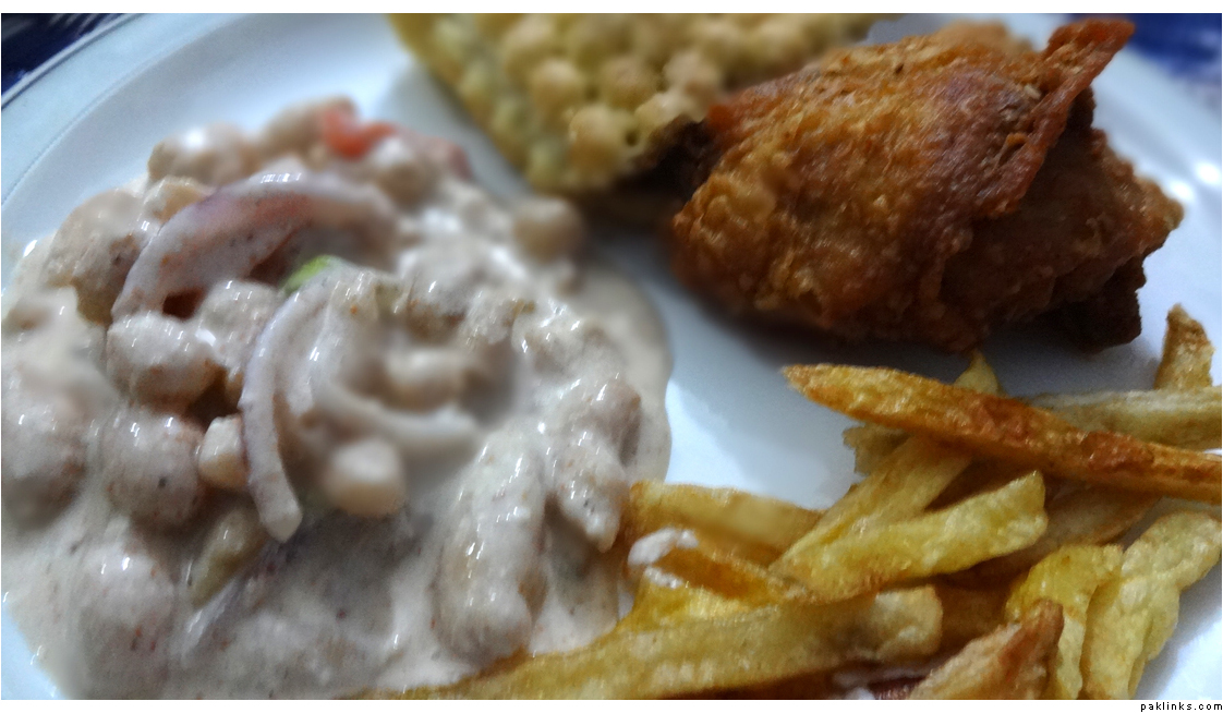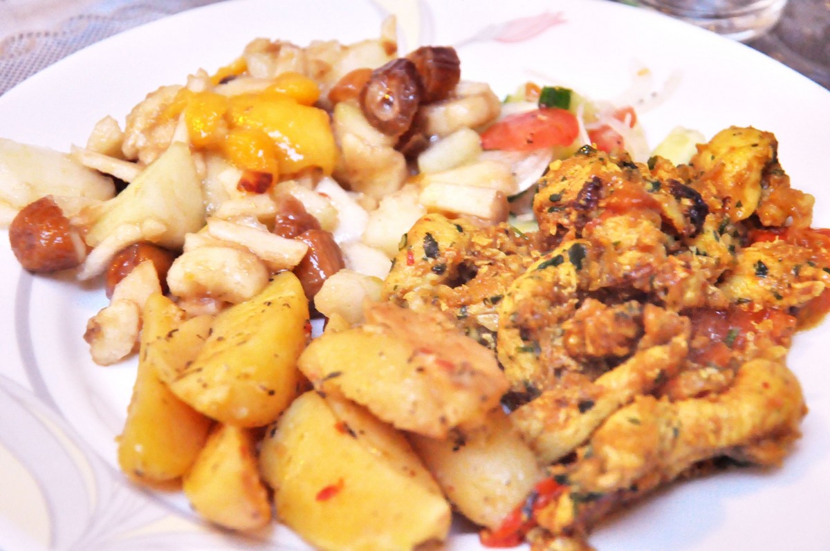 Today’s iftaar : Chicken with potatoes, fruit chaat and lahmacun.