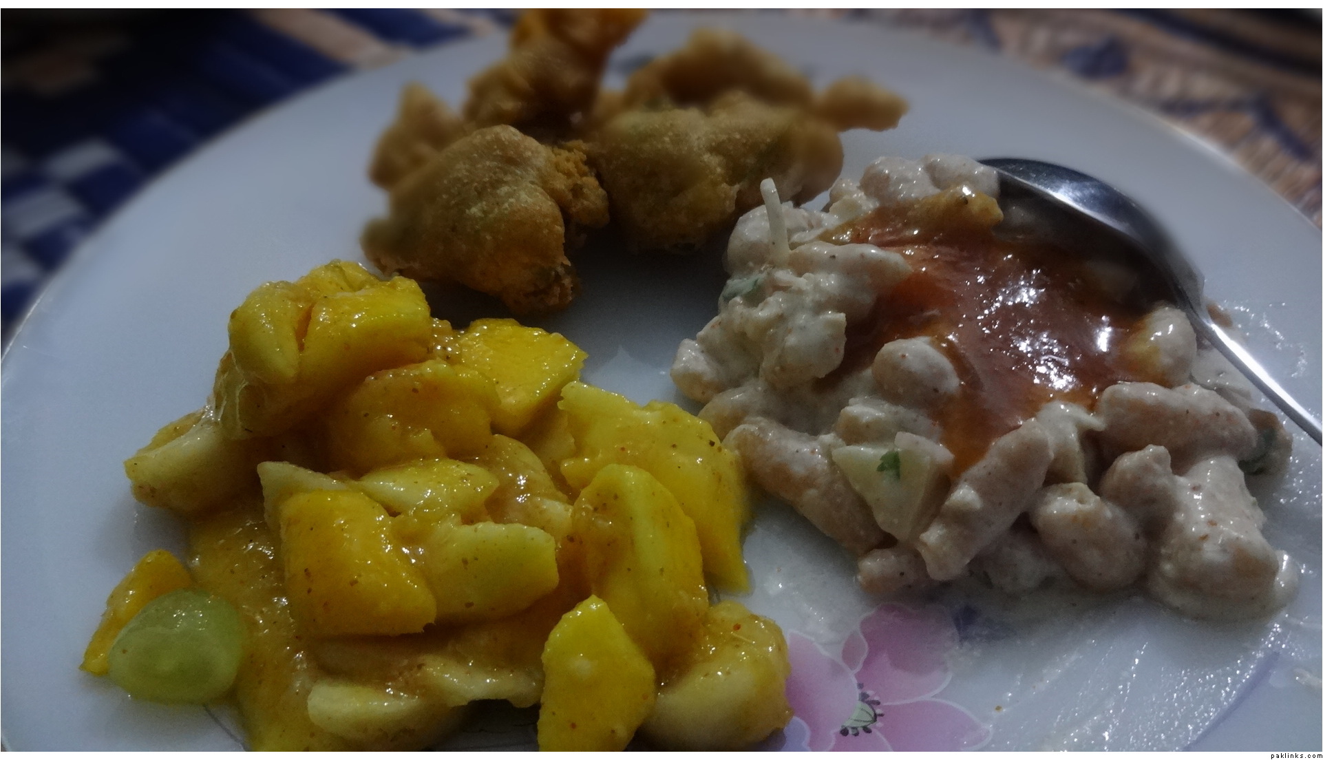 Today's iftaar : Chicken with potatoes, fruit chaat and lahmacun.