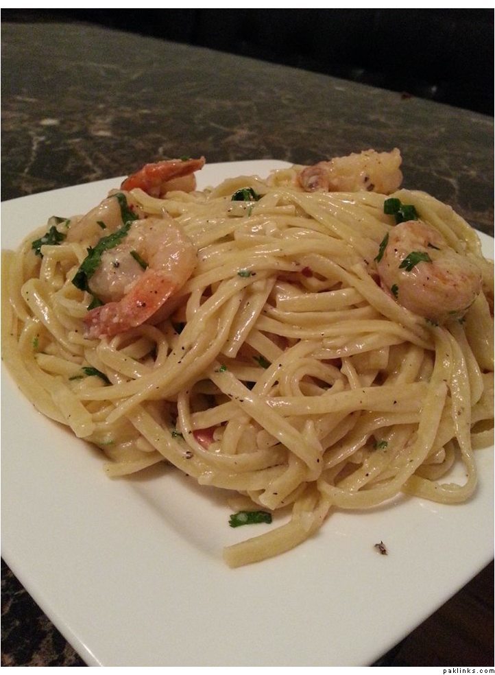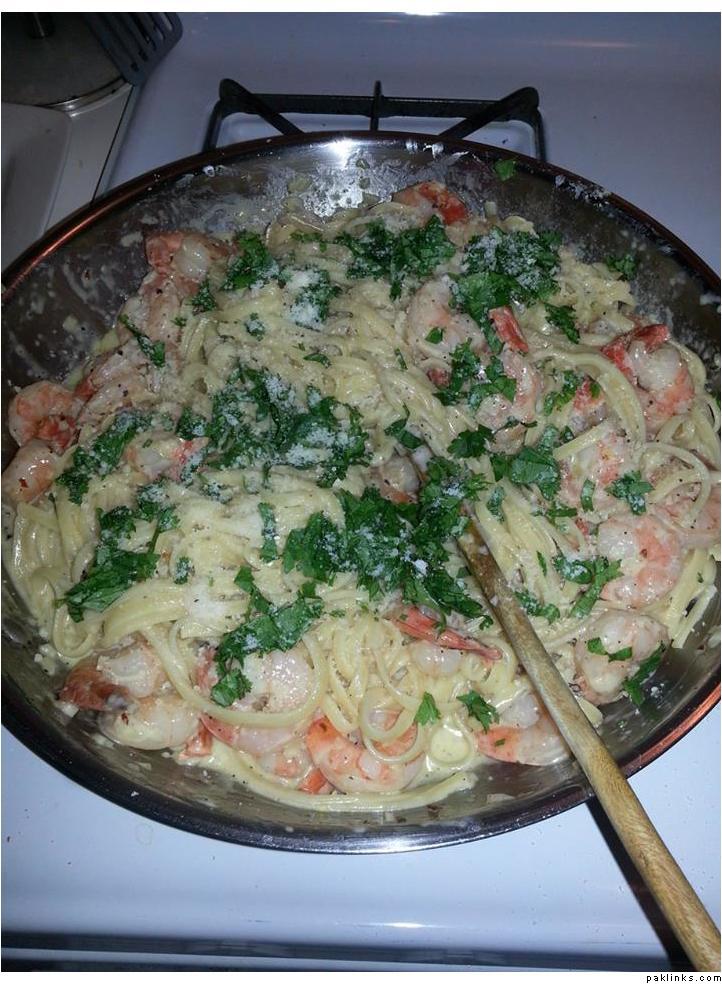 In the same skillet, add the cream (or half and half) and lower the heat...let it simmer and then season with salt and pepper. Let it simmer until it reduces and thickens a little bit. Add the shrimp back in and add the pasta as well...add lemon juice, lemon zest and a handful of grated Parmesan cheese and toss to combine. Add the parsley/coriander at the end. Done :)