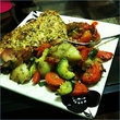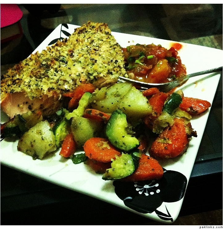 herb-crusted salmon (thanks to khatti for the recipe and answering countless questions ) and baked veggies with spicy-mango salsa