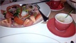 salmon cakes–leftover salmon steak, diced red onion, coriander, egg and panko breadcrumbs. make patties and pan fry.