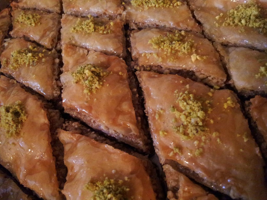 Homemade pecan & walnut baklava topped with pistachios.