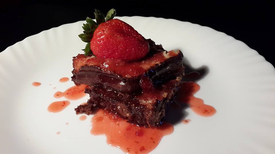 Vanilla Cake with Chocolate centre and icing. Drizzled with Strawberry Couli.