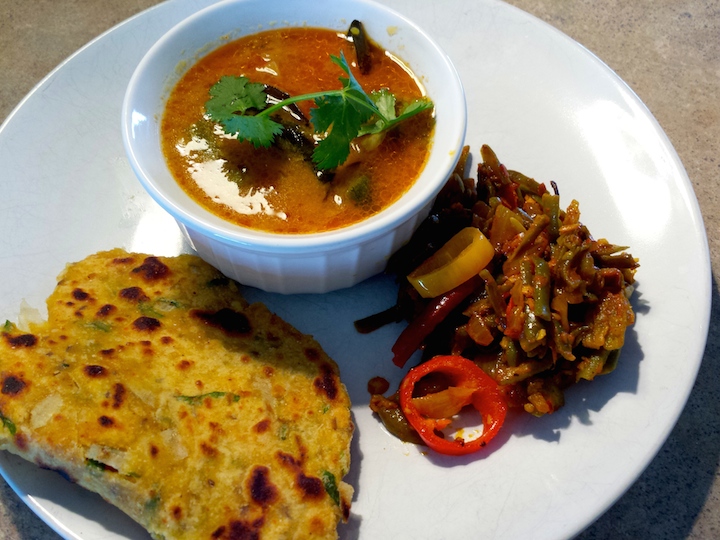 Besan ki roti, Arhar daal, french beans + sweet peppers sabzi