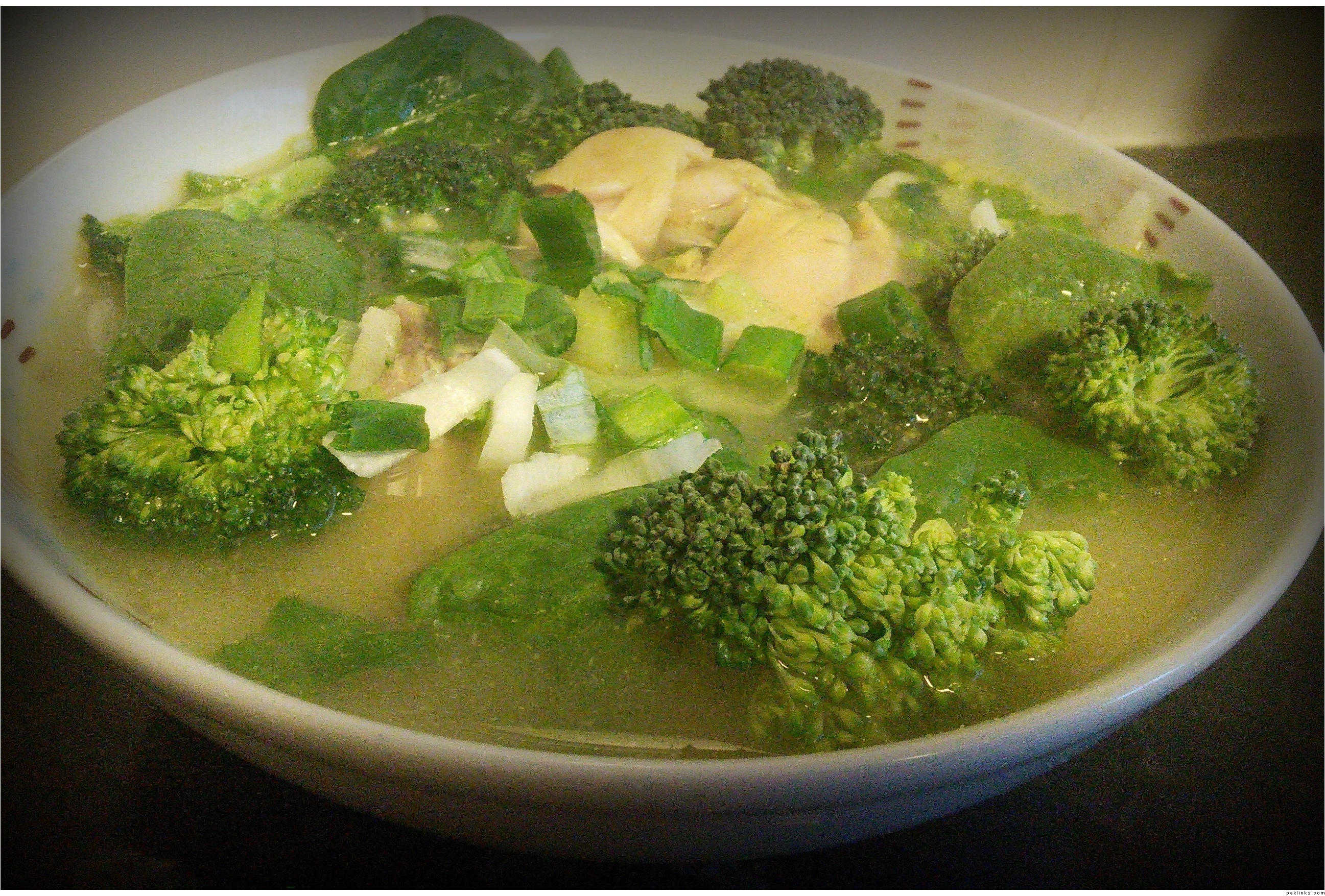 Cooked chicken soup ,had it with green vegetables e.g spinach, spring onion and broccoli.
